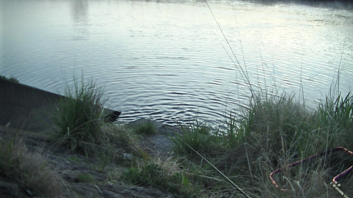 歩き疲れたので水門の横にへたり込んで、高比重ワームをノーシンカーで水門へ投げっぱなしにしているとしばらくして”コツン”と小気味よいアタリが・・・。